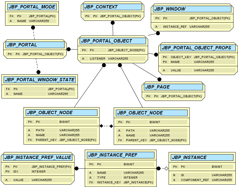This set of tables includes all of the portal objects that are related to building portal pages, portal page windows and portlet instances. The portal Admin GUI will add/update/delete entries from these tables whenever you create/modify a portal, portal page, portlet or portlet instance.