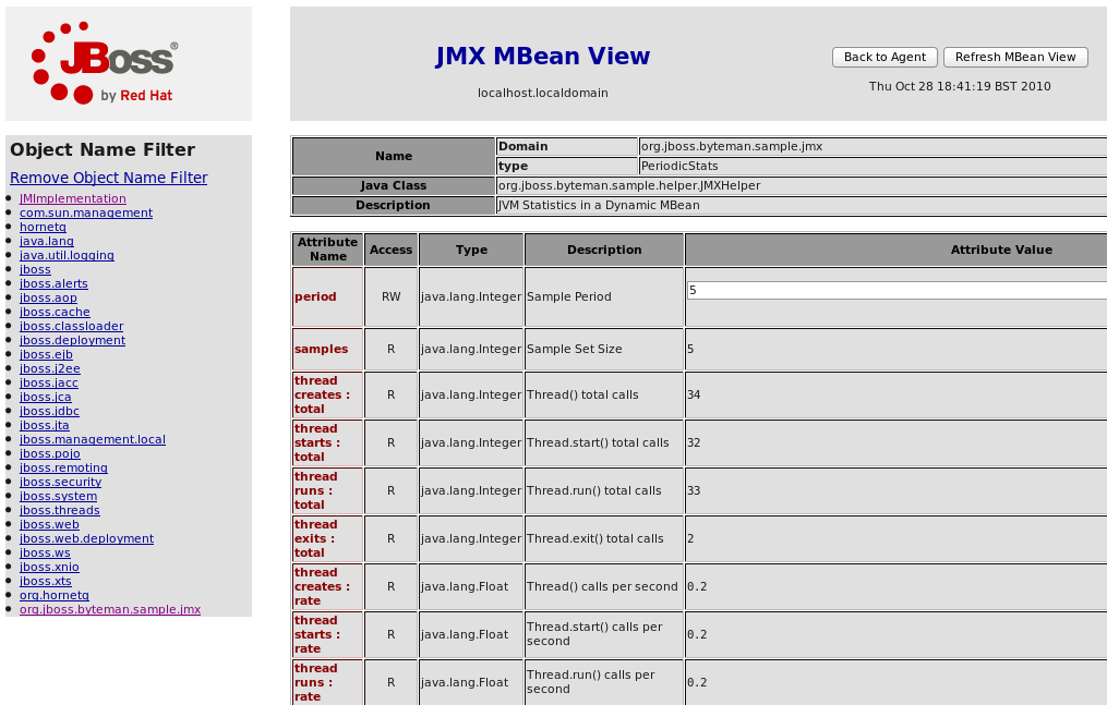 Yes, you need to do more in order to provide access to the MBean server. The sample script/helper are built just to show off the capabilities on the Byteman side. I hope it is clear that this provides enough leverage to support a very general monitoring capability via JMX. Of course, JMX is not the only option for making the statistics available and I want to develop this in other directions, RHQ integration being an obvious way to go. IDE support for rule development and management is another area that needs work.
